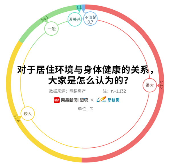 網(wǎng)易房產(chǎn)的調(diào)查數(shù)據(jù)顯示,在居住環(huán)境與身體健康的關(guān)系中,有50.7%的受訪者認(rèn)為居住環(huán)境和身體健康的關(guān)系很大,33.4%認(rèn)為關(guān)系較大,只有1.1%的人覺得沒有關(guān)系。