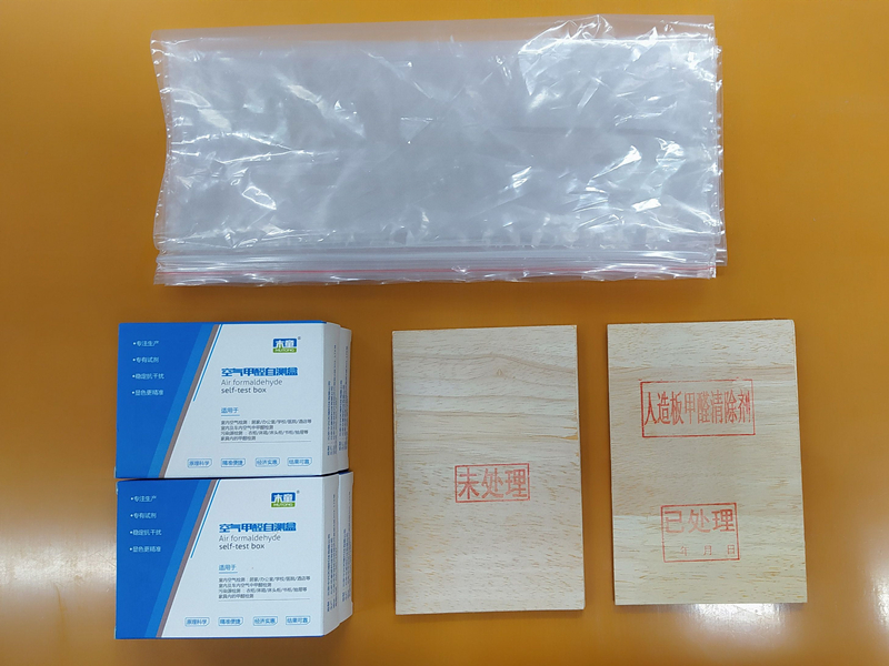 體驗裝中有兩塊七厘板,一塊用人造板甲醛清除劑處理過,一塊沒有處理過,將這兩塊板分別放入自封口的塑料袋中,密封2-6小時。然后再分別放入甲醛自測盒,30分鐘后就能測得兩塊板子釋放出來的甲醛含量。通過這個簡單的方法,就能驗證人造板甲醛清除劑是否有效。